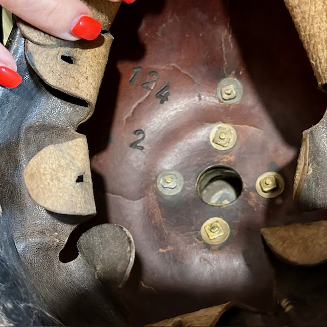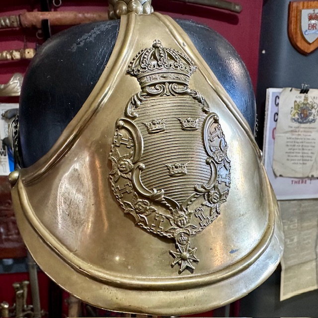Swedish Model 1881 Royal Dragoons NCO Spiked Cavalry Helmet.This is a Swedish Model 1881 Dragoon Non-Commissioned Officer's leather helmet mounted in brass with spike top. It has the correct non-Commissioned Officer's brass scaled chin straps. Full leather liner with Swedish Regimental numerals stamped on the interior. Large brass helmet plate to front displaying the large "domed" Crown over three Coronets which represents the Royal House of Sweden.