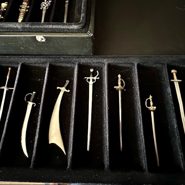 There are 24 swords superbly detailed in this presentation cased set - the swords all relating to famous people throughout history from all over the world. This would make a great gift for the man that has everything (except this!) and to add to his full size atique sword collection. A great man cave and discussion piece. All have blades and can be drawn out of thier scabbards, but all in superb metal miniture scale.