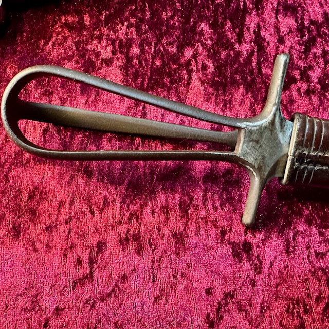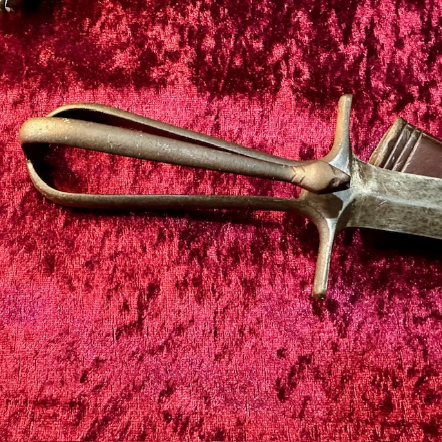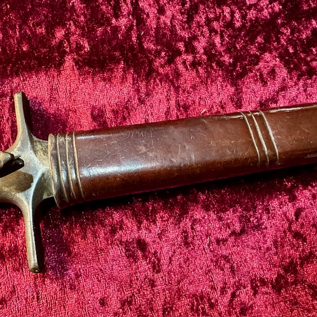 An unofficial trench knife made from a single piece of steel. Apparently designed by Henri Caux, who ran the company with his brothers. Two main variants exist, of which this is the latter. The first variant was of less refined construction and featured a narrow, leaf-shaped blade. Many examples of the second variant are adorned with a snake's head finial on the grip.