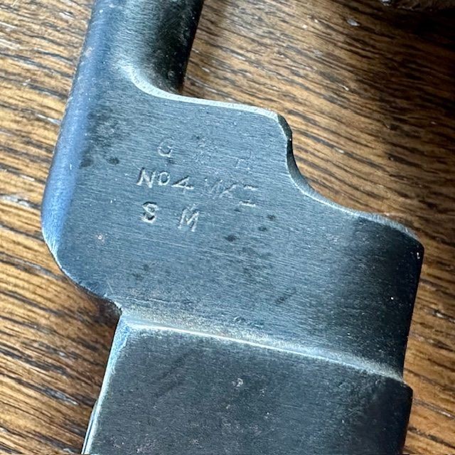 A rare example of a cruciform bladed No. 4 with a rare variation scabbard. These are very hard to find in this condition and original.