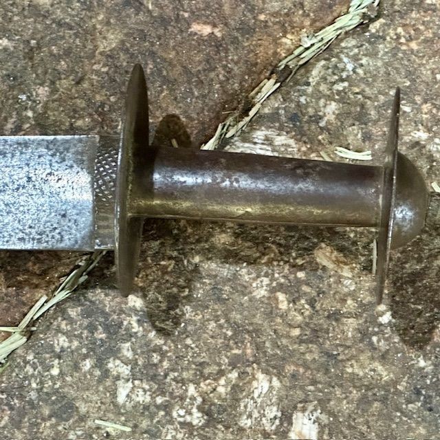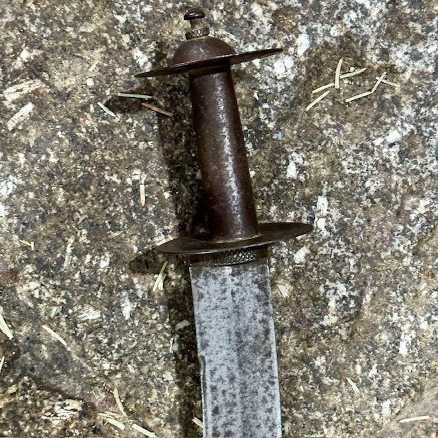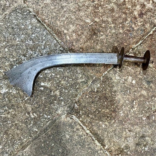 This is an antique 18th Century Nepalese Kora (Khuda, Cora, Khora, Kouda) from Nepal. Similar weapons in nearby India are known as Kharga or Jamadhar Teg. The kora is classic example of this famous fighting sword of the Gurkas. It is in a good condition with wonderful patina. This iron hilt is traditional in design with disk-shaped guards. Kora swords were used in Nepal and North India for both fighting and sacrificial processes. They are quite similar, only the sacrificial sword is wider and heavier. Sometime well after the 10th century A.D., the forward-angled blade appeared in Nepal. The kora was primary weapon of the early Gurkhas and other tribes in the area with the earliest examples known from the mid 18th century. The kora sword ranges in length from 18-28 inches, with the blade sharpened on the inside edge. The tip curves forward and flares out and down when held in the hand. Though the shape was completely useless for a thrust, the power in the downward cut was awesome. The firearm assumed the place of principal weapon of the Gurkha. The kukri, which had many uses, was kept and the kora was discarded. Today the kora is only used as a ceremonial execution weapon of bullocks at the festival of Dasain (referred to as Dashera in India and by the original British Regiments). Lord Egerton of Tatton, who writes: '[the Gurkhas'] national weapon is the kukri, originally a kind of bill-hook, for cutting through small wood in the dense low jungles of the Teraí and the Himalayans' (pg. 100). The Nepalese also use a larger knife, or sword, called a kora, which also has an inner cutting edge like the khukuri." The blades of koras show an expansion near the point, weighting the tip to provide a more powerful downward blow. Koras are generally ceremonial, and as Egerton remarks, 'those who use it skillfully are enabled to cut a sheep in two at a single blow'