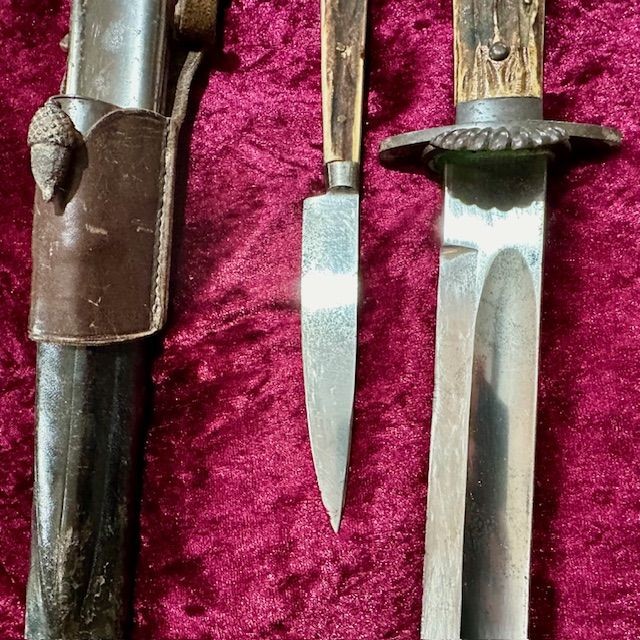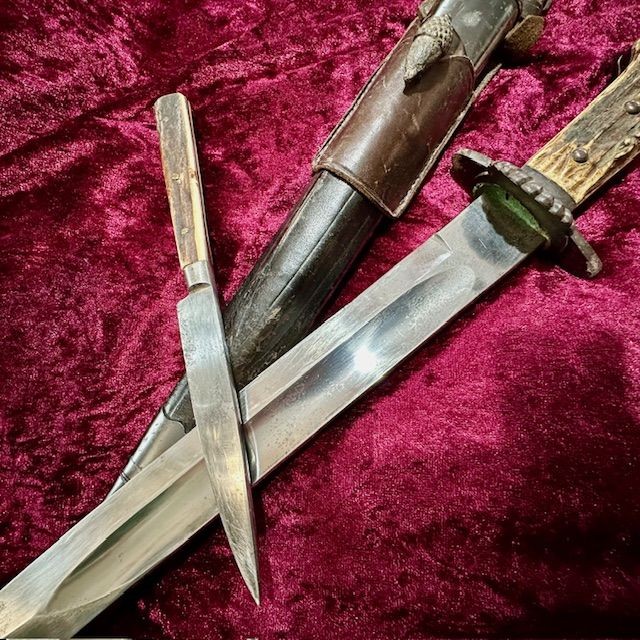 A superb and robust antique German hunting hanger by 'Carl Eickhorn' (Pre 1906) with bi-knife in scabbard. A wonderful example and complete with its original hanger.