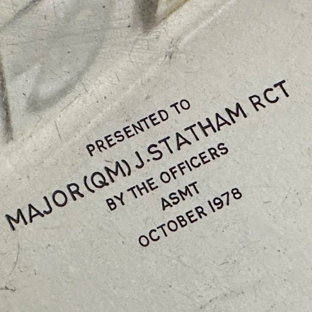 A nice pair of medals here to T/10714493 Sgt. J. Statham, Royal Army Service Corps (later Major, Royal Corps of Transport). - WW2 War Medal - GRVI GSM (1918-62) Singel Clasp 'Malaya' T/10714493 Sgt. J. Statham, Royal Army Service Corps Complete with miniature medals, medal ribbon bar and a pewter presentation tray (10 inches in diameter) engraved as follows: 'Presented To Major (Q.M.) J. Statham R.C.T. By The Officers A.S.M.T. October 1978' John Statham was born at Alton, Hants on 1st July 1929 and served in the ranks for 21 years and 49 days. He was promoted to WO1 (RSM) He was commissioned into the R.C.T. as a Lieutenant on 21st February 1966, Captain (QM) on 22nd May 1969 and Major (Q.M.) on 6th October 1975. The RCT Journal shows that in the 1960s he served as an RSM of the 433rd (Forth) Transport Column RASC. (TA) and at HQ RASC (AER). He was was later an officer with 10 Regiment, 12 Driver Training Regiment and at the RCT Depot as well as at HQ NE District UKLF. He retired on 12th October 1978 and sadly passed away in Truro, Cornwall in January 2004. Supplied with resarch documents/ package.