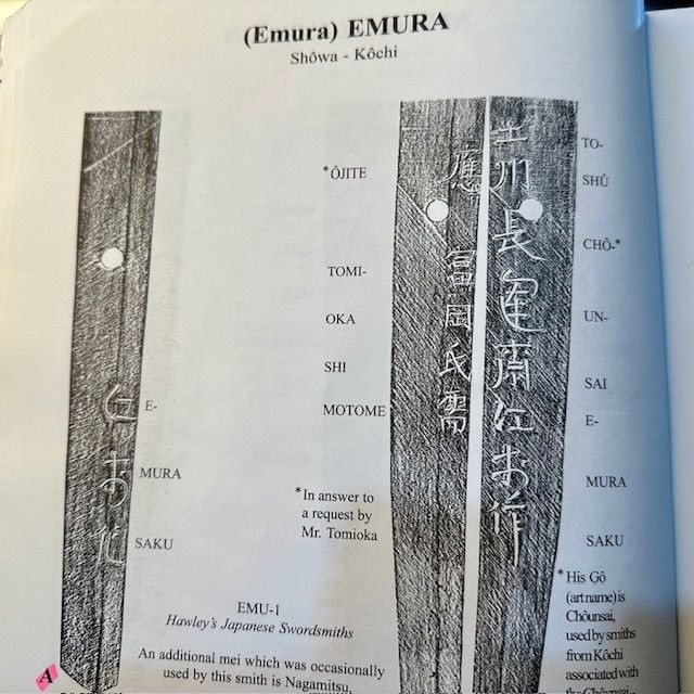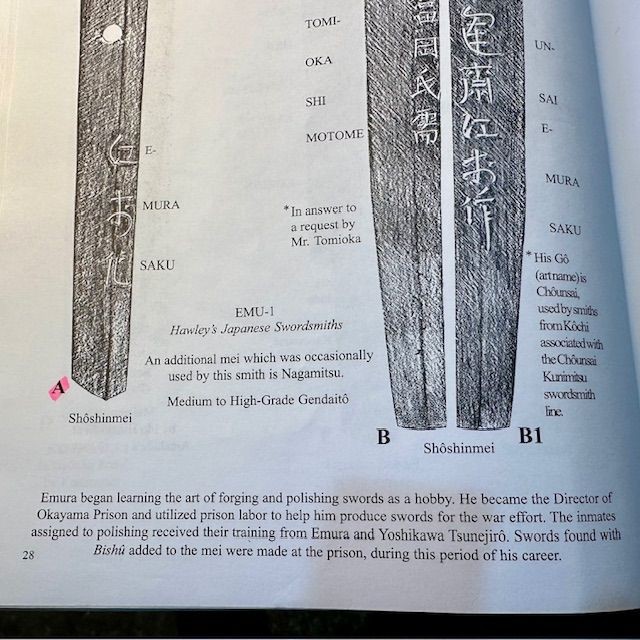 Yoshikawa Tsunetaro (father of the current NTHK head, Yoshikawa Kentaro) wrote an article in the Token Synzu called 'Nihonto to Kyo ni', which means roughly, 'Swords and I'. Yoshikawa reminisces about his days as a polisher and official for the military's sword polishing office during the war years. In the middle of the article, he mentions an Emura san, the head of a prison in Okayama. Yoshikawa states that in his official capacity, he often travelled around the country to inspect and looked in on various tanrenjo around the country. He mentions that his visit to this prison forge was perhaps the most touching of his trips. He states that Emura san signed blades 'Emura' and sometimes 'Emura Chounsai'. He said that he made blades in the Bizen style with choji hamon.