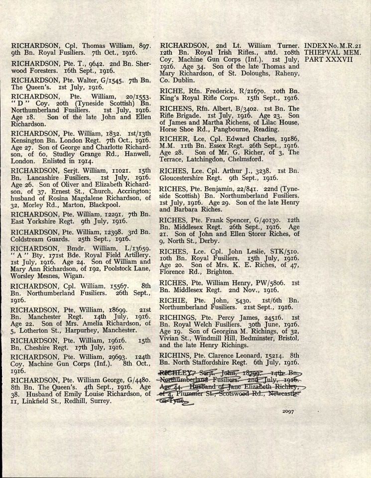 'William Richardson' 20th (Tyneside Scottish) Bn. Northumberland Fusiliers