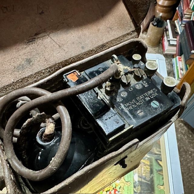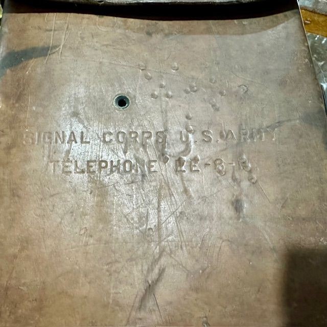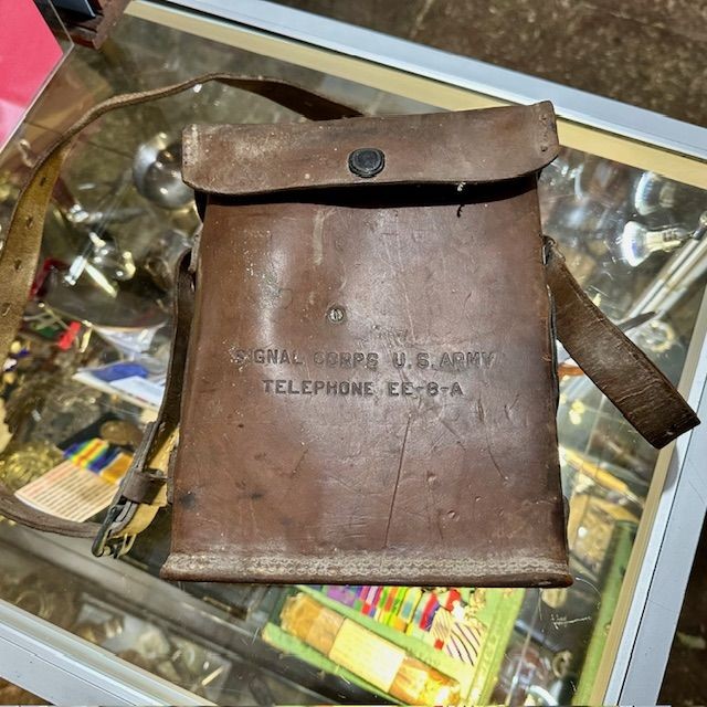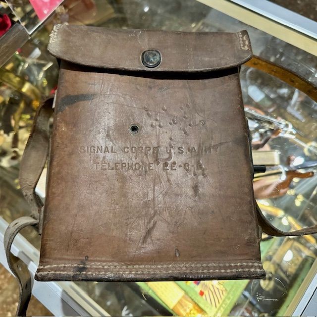 United States EE-8 field telephone from World War 2. The EE-8 field telephone was used by the US Military from 1935 into the Vietnam War. It used a wired line with a maximum transmission distance of 7 miles. The EE-8 uses D cell batteries to power the electric signal that carries the signal through the wire to the other phone. It has a hand-cranked dynamo to generate the charge that rings the phone on the other end of the line. During World War 2, the phone was preferred to the radio, as it was much more reliable than the backpack mounted Walkie-Talkie. The phone line, which could be run through a switchboard from a command centre, was often run by soldiers during combat situations. This telephone comes with its original leather case and straps.
